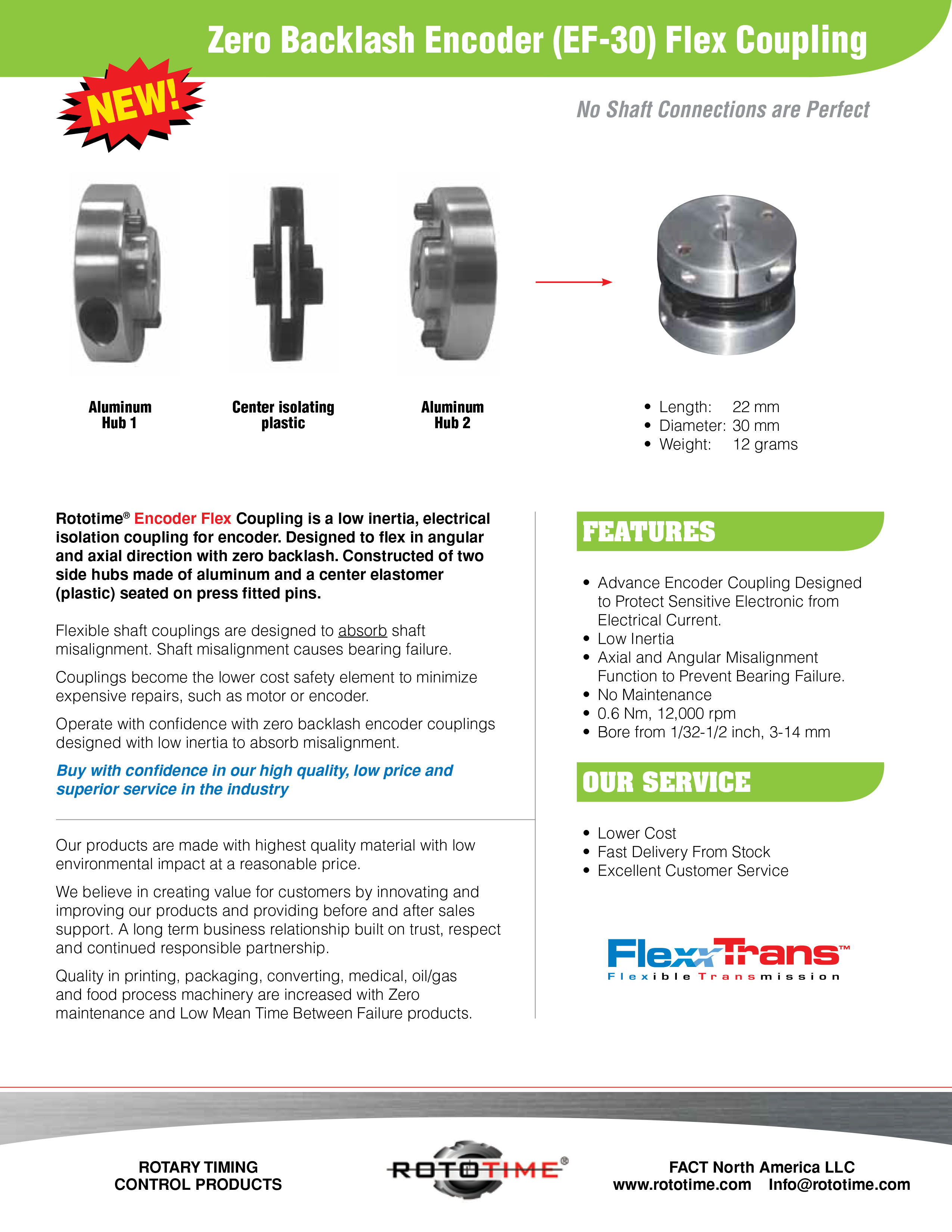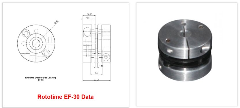 Rototime Encoder Flex coupling is made with 6061 Aluminum hubs separated with a unique flex polyurethane material. The coupling has very little inertia and provide electrical isolation. The design style utilizes the stiffness of a Disc coupling with the flexibility and isolation of an Oldham coupling.