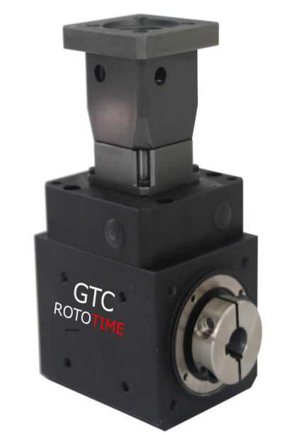 GTC-Rototime Servo/Stepper Gearbox GTC-Rototime– Right-Angle, Hollow output shaft, Bevel Gearbox offer versatility in design. The GTC series comes standard with a motor adaptor plate to mount to any motor. Output ratio from 1:1-200:1. The square housing is made with high strength Aluminum and black oxide. The precision cut spiral bevel gears are heat treated and lapped. Features