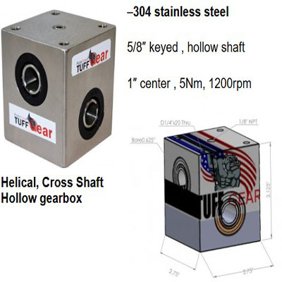 Technical Data Simplify packaging and food machinery drive train with a 304 stainless steel, hollow cross-shaft gearbox. Cross-shaft gear design reduces the use of belt and shaft couplings with hollow 90 degree input for direct mounting to shafts. The gearbox is compact with 3.2×2.75 inch made with 1/4 inch through holes for mounting. The holes can be tapped 1/4″x20.